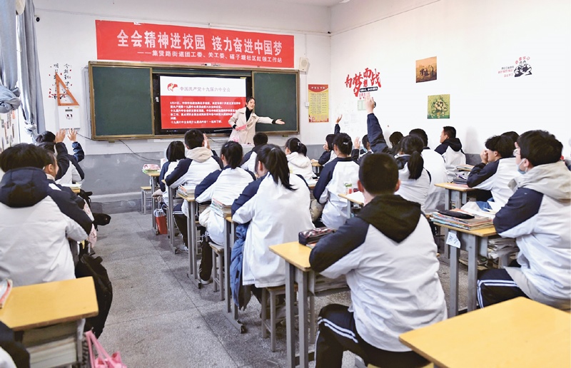 2021年11月24日,安徽省安慶市大觀區(qū)集賢路街道團(tuán)工委、碟子塘社區(qū)紅領(lǐng)工作站聯(lián)合開展黨的十九屆六中全會精神宣講進(jìn)校園活動。中新社發(fā)項(xiàng)順平/攝