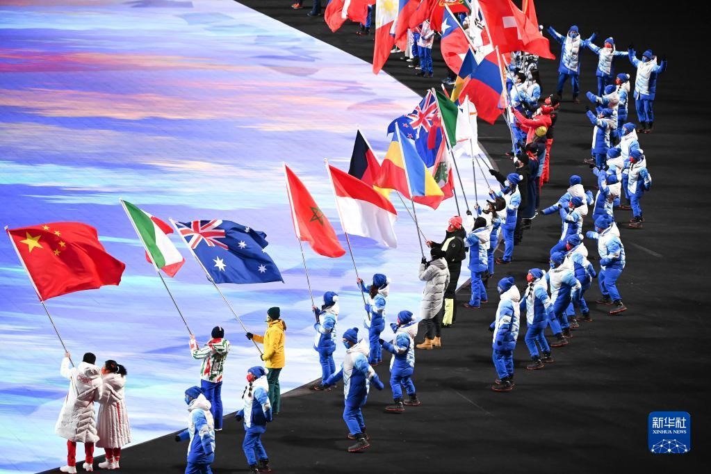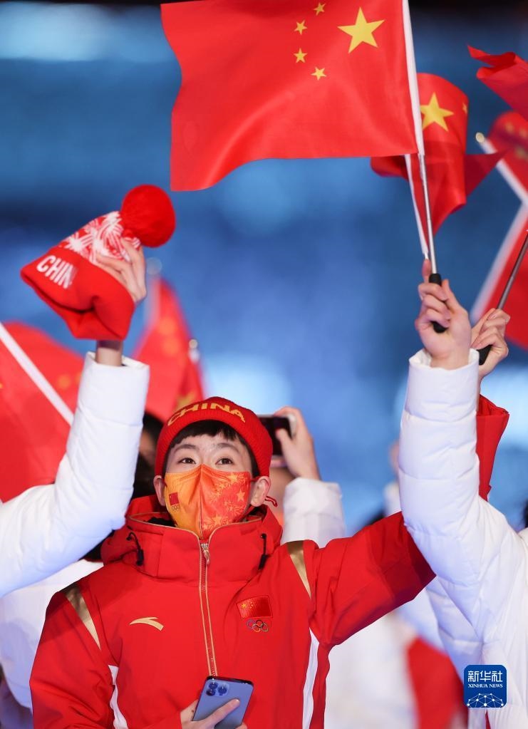 這是中國(guó)代表團(tuán)旗手徐夢(mèng)桃與高亭宇在閉幕式上入場(chǎng)。