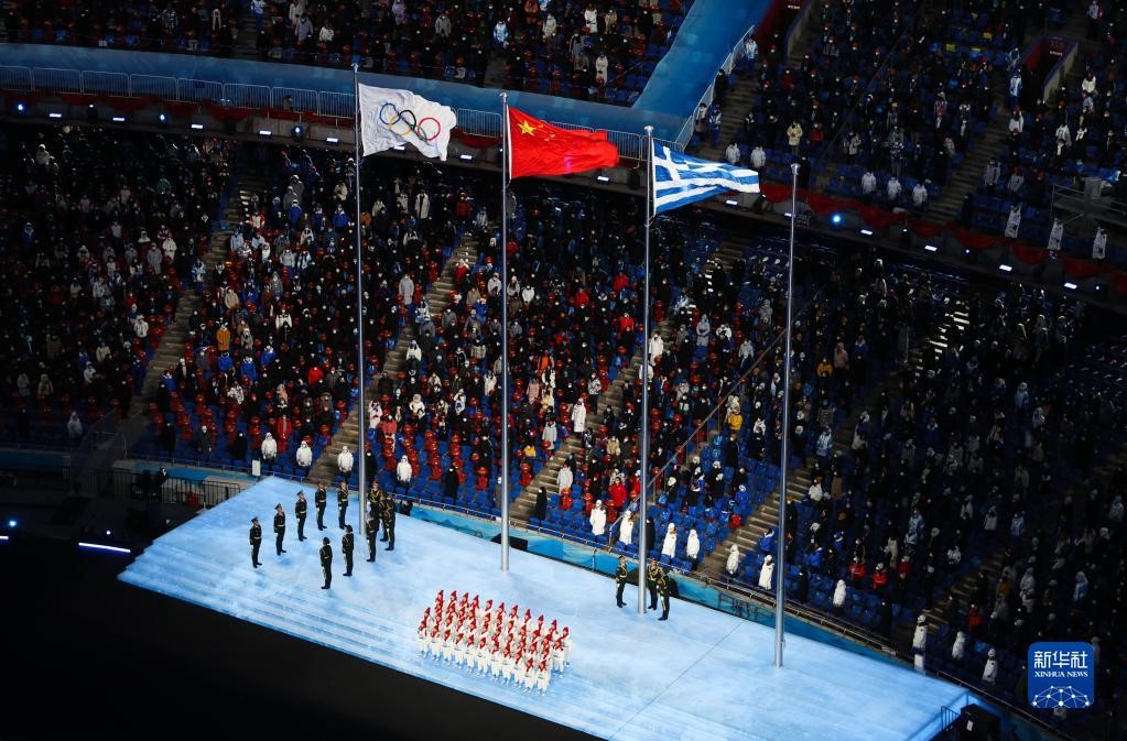 這是奧林匹克會(huì)旗與中華人民共和國(guó)國(guó)旗在閉幕式上飄揚(yáng)。