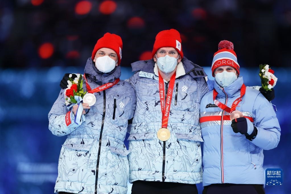 這是越野滑雪男子50公里集體出發(fā)(自由技術(shù))冠軍俄羅斯奧委會(huì)選手亞歷山大·博利舒諾夫(中)、亞軍俄羅斯奧委會(huì)選手伊萬·亞基穆什金(左)和季軍挪威選手西蒙·赫格斯塔德·克呂格爾在獎(jiǎng)牌頒發(fā)儀式上。