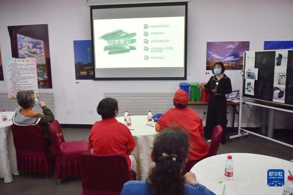 在北京建國(guó)門街道趙家樓社區(qū)議事廳舉行的“兩桶一袋”居民征求意見(jiàn)懇談會(huì)上,來(lái)自社區(qū)的12位垃圾分類達(dá)人對(duì)“兩桶”款式進(jìn)行投票選擇,同時(shí),街道針對(duì)桶站位置、定時(shí)定點(diǎn)投放等垃圾分類運(yùn)營(yíng)管理聽取居民意見(jiàn)(2020年5月2日攝)。新華社記者彭子洋攝