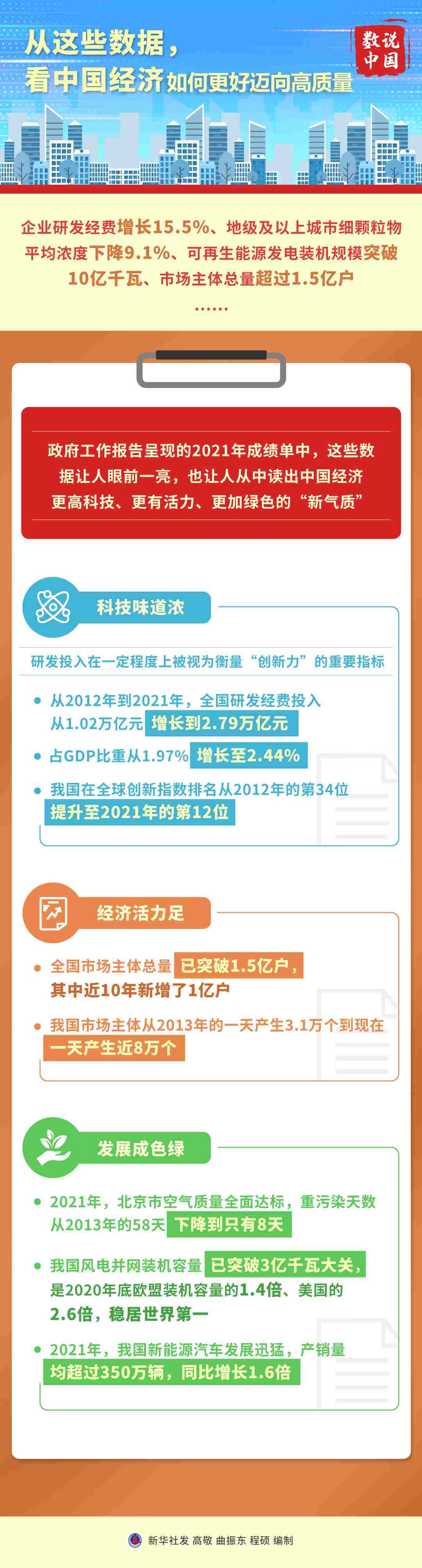 企業(yè)研發(fā)經(jīng)費(fèi)增長15.5%、市場主體總量超過1.5億戶、可再生能源發(fā)電裝機(jī)規(guī)模突破10億千瓦……政府工作報(bào)告呈現(xiàn)的2021年成績單中,這些數(shù)據(jù)讓人眼前一亮。同時(shí),報(bào)告的一系列新部署,也讓人從中讀出中國經(jīng)濟(jì)更重創(chuàng)新、更加綠色,更堅(jiān)定邁向高質(zhì)量發(fā)展。