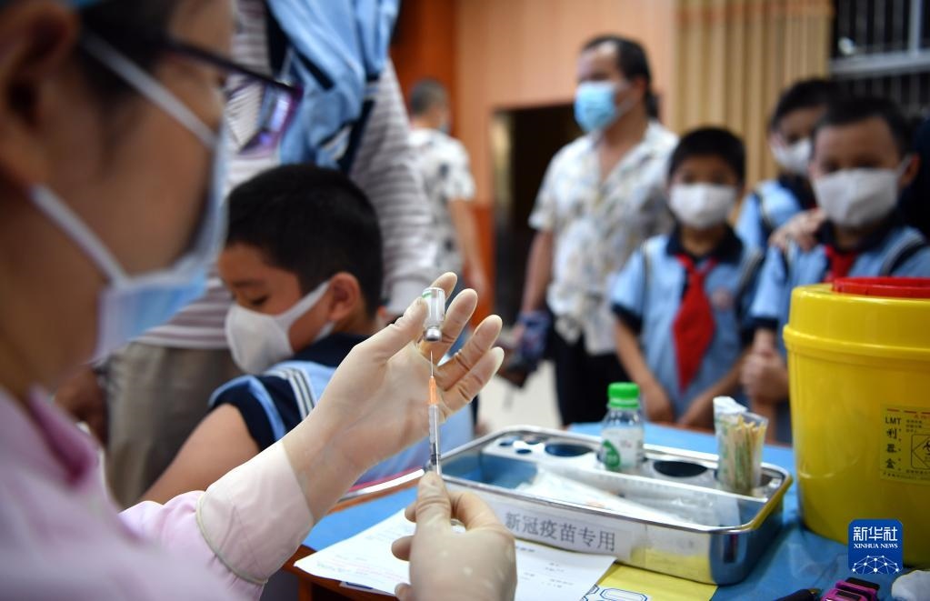 醫(yī)護人員在??谑协偵降谌W(xué)為學(xué)生接種疫苗(2021年10月28日攝)。新華社記者 郭程 攝