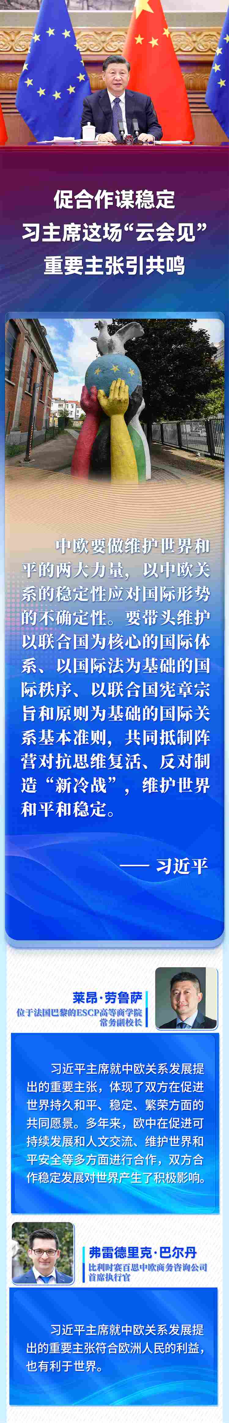 國家主席習(xí)近平4月1日晚在北京以視頻方式會(huì)見歐洲理事會(huì)主席米歇爾和歐盟委員會(huì)主席馮德萊恩。歐洲多國人士高度評(píng)價(jià)習(xí)近平主席就中歐關(guān)系、烏克蘭危機(jī)等問題提出的重要主張,認(rèn)為會(huì)晤為雙方關(guān)系持續(xù)健康發(fā)展作出戰(zhàn)略引領(lǐng),為復(fù)雜動(dòng)蕩的國際局勢注入穩(wěn)定性。