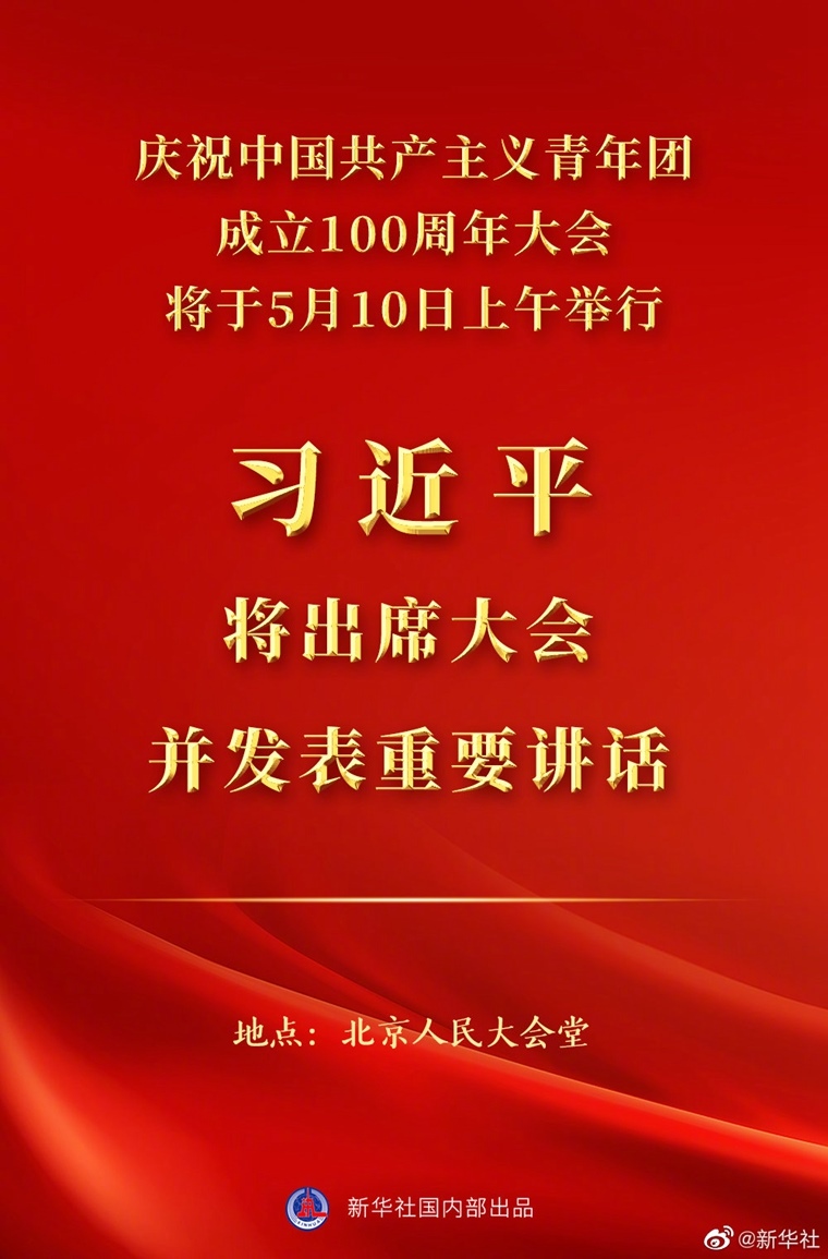 新華社北京5月8日電慶祝中國(guó)共產(chǎn)主義青年團(tuán)成立100周年大會(huì)將于5月10日上午在北京人民大會(huì)堂隆重舉行。中共中央總書記、國(guó)家主席、中央軍委主席習(xí)近平將出席大會(huì)并發(fā)表重要講話。
