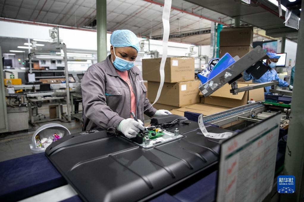 2022年6月1日,當(dāng)?shù)貑T工在南非開普敦海信南非工業(yè)園的電視機生產(chǎn)線上工作。新華社記者呂天然攝