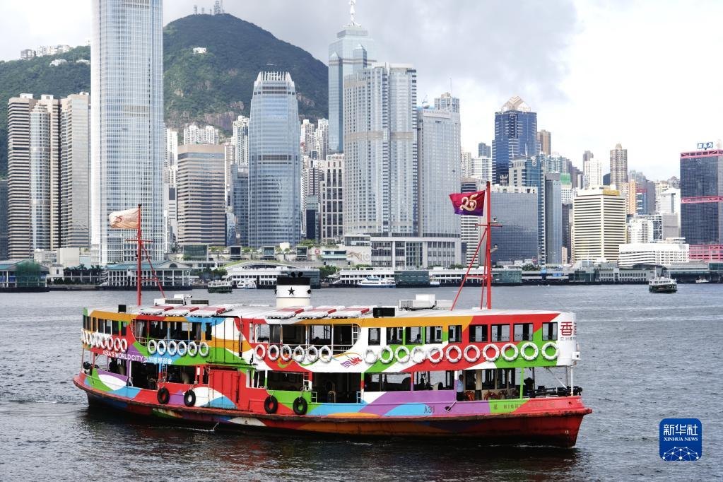 在香港尖沙咀天星碼頭,天星小輪載著慶祝香港回歸祖國(guó)25周年標(biāo)志的旗幟在維港航行(2022年6月22日攝)。新華社記者 王申 攝