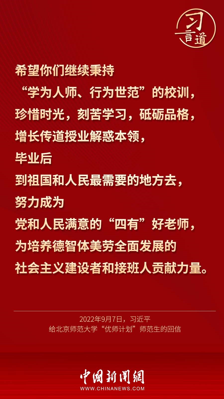 9月7日,習近平總書記回信勉勵北京師范大學“優(yōu)師計劃”師范生,努力成為黨和人民滿意的“四有”好老師。十八大以來,習近平多次通過書信的形式,對教師群體寄予殷切期望。