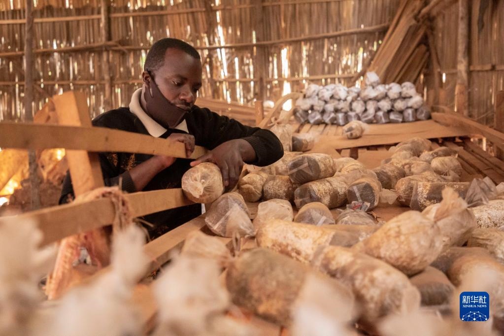 在盧旺達首都基加利的一家食用菌培育作坊,作坊主人埃馬紐埃爾·阿希馬納檢查菌袋(2020年9月9日攝)。中國福建農(nóng)林大學(xué)的菌草專家2006年來到盧旺達開始菌草技術(shù)合作項目,在當(dāng)?shù)厥痉逗屯茝V菌草技術(shù)。新華社發(fā)(西里爾·恩德格亞攝)