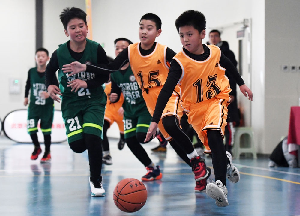 ↑新疆烏魯木齊市烏魯木齊縣第一中學(xué)小學(xué)部冰球隊的學(xué)生在進(jìn)行冰球比賽(2022年1月12日攝)。
