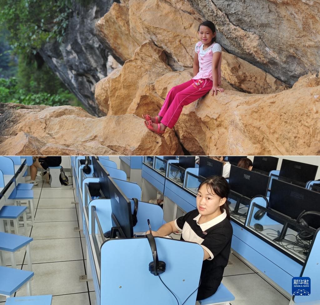 這是一張拼版照片,上圖為:在廣西大化瑤族自治縣板升鄉(xiāng)弄雷村哈保屯,11歲的蒙秋艷在懸崖邊休息,這一處約300米長的半山懸崖,是她讀小學期間每天都要走的路(2012年9月5日新華社記者黃孝邦攝);下圖為:已經實現(xiàn)大學夢想的蒙秋艷,就讀于廣西醫(yī)科大學,這是她在學校的語音室學習(新華社發(fā),2022年9月5日韋婷婷攝)。新華社發(fā)
