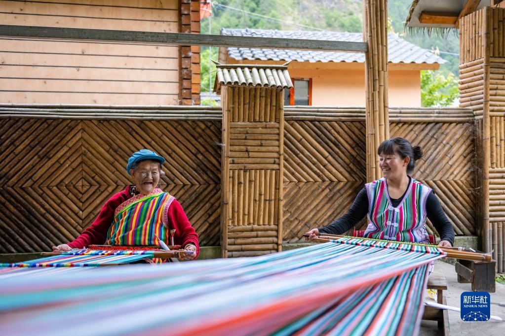 在云南省貢山獨龍族怒族自治縣獨龍江鄉(xiāng)迪政當村,獨龍族老人李文仕(左)和女兒在編織獨龍?zhí)海?022年5月10日攝)。新華社記者 曹夢瑤 攝
