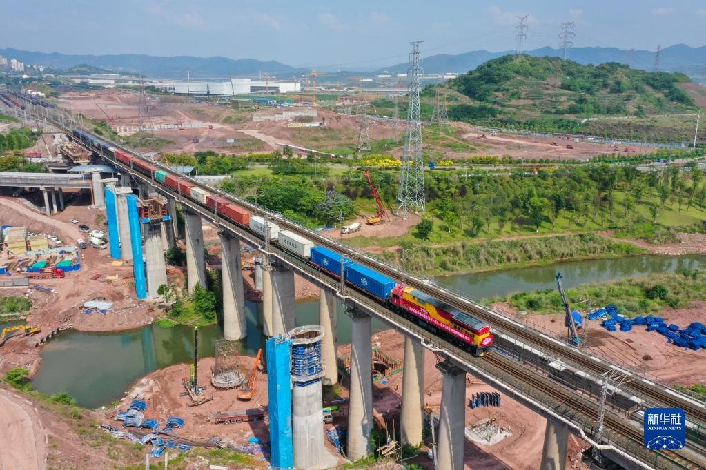中緬新通道(重慶—臨滄—緬甸)國(guó)際鐵路班列從重慶果園港魚嘴車站順利發(fā)車(5月23日攝,無(wú)人機(jī)照片)。新華社記者 唐奕 攝