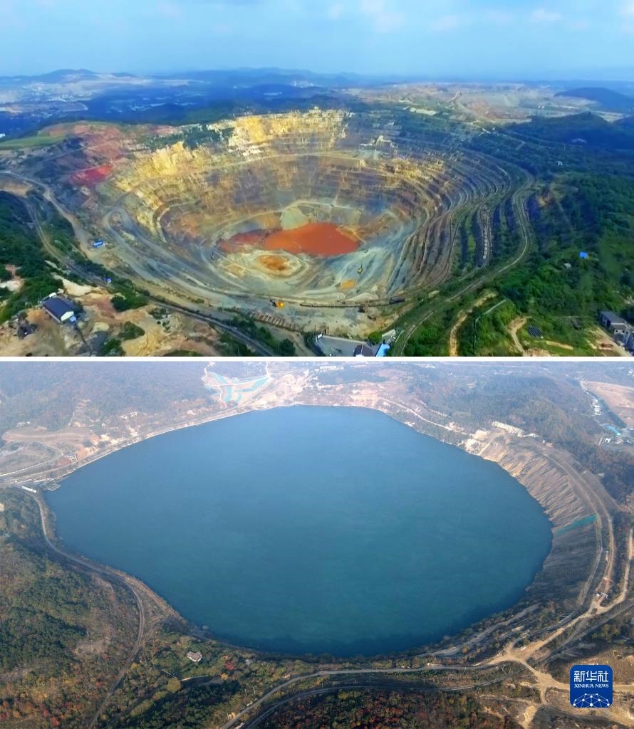 拼版照片:上圖為開(kāi)采中的安徽省馬鞍山市雨山區(qū)向山鎮(zhèn)凹山采場(chǎng)(資料照片),下圖為生態(tài)修復(fù)后的凹山采場(chǎng)(新華社記者劉軍喜11月8日攝,無(wú)人機(jī)照片)。新華社發(fā)