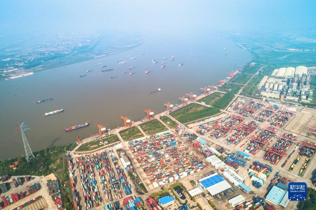 這是武漢長(zhǎng)江中游航運(yùn)中心核心港陽(yáng)邏港(2020年4月12日攝,無(wú)人機(jī)照片)。新華社記者 肖藝九 攝
