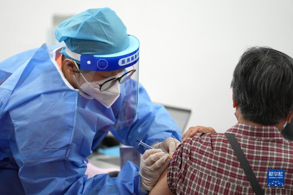 在北京市朝陽區(qū)奧運(yùn)村街道一處新冠疫苗接種點,醫(yī)護(hù)人員為一市民接種新冠疫苗加強(qiáng)針(2022年7月13日攝)。新華社記者鞠煥宗攝