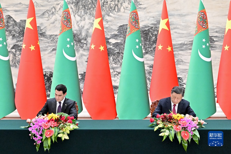 會談后,兩國元首簽署并發(fā)表《中華人民共和國和土庫曼斯坦聯(lián)合聲明》,共同見證簽署“一帶一路”、綠色發(fā)展、數(shù)字經(jīng)濟(jì)、衛(wèi)生、文化、體育、新聞媒體、天然氣等領(lǐng)域合作文件。