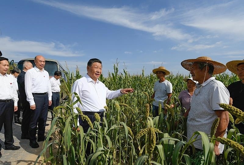 △2021年9月13日,習(xí)近平總書(shū)記在陜西米脂縣高西溝村臨時(shí)下車(chē),察看糧食作物長(zhǎng)勢(shì),同正在田間勞作的老鄉(xiāng)拉家常。