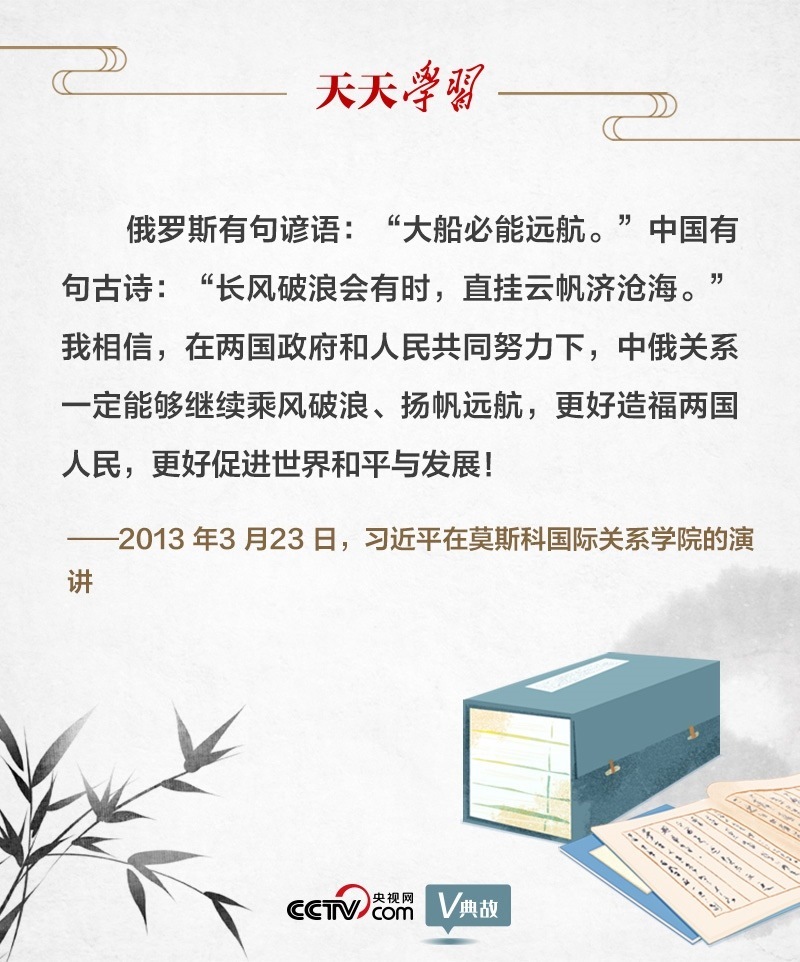 關(guān)于中俄關(guān)系,早在10年前在莫斯科國際關(guān)系學(xué)院的演講中,習(xí)近平主席就有精辟闡述。演講結(jié)束語中,習(xí)主席首先引用一句俄羅斯諺語“大船必能遠(yuǎn)航”,拉近了與俄羅斯民眾的文化空間和心理距離。接著引用了含義相近的中國古詩“長風(fēng)破浪會有時,直掛云帆濟(jì)滄海”,讓對方在文化相似性中深刻領(lǐng)悟其中道理。最后凝聚共同理念:“中俄關(guān)系一定能夠繼續(xù)乘風(fēng)破浪、揚帆遠(yuǎn)航”。