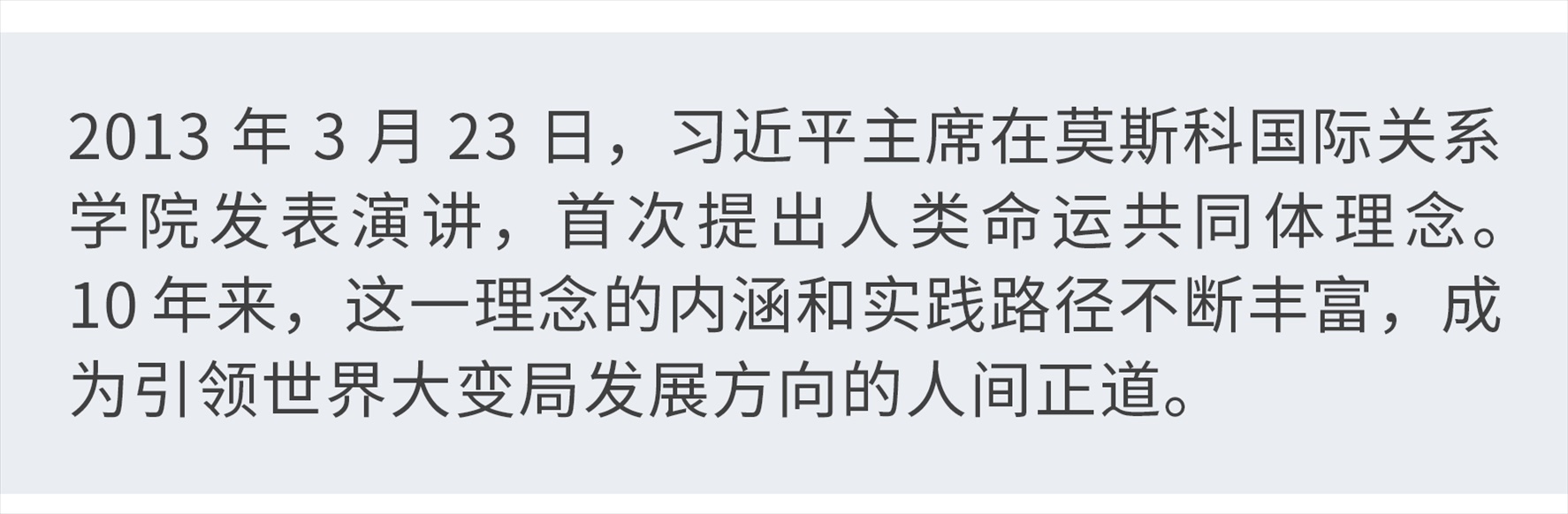 10年前,也是在早春時(shí)節(jié),習(xí)近平主席在莫斯科國(guó)際關(guān)系學(xué)院發(fā)表演講,首次提出人類命運(yùn)共同體理念——“這個(gè)世界,各國(guó)相互聯(lián)系、相互依存的程度空前加深,人類生活在同一個(gè)地球村里,生活在歷史和現(xiàn)實(shí)交匯的同一個(gè)時(shí)空里,越來(lái)越成為你中有我、我中有你的命運(yùn)共同體?!?/p>