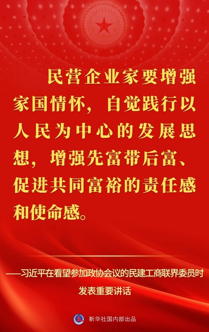 “黨中央始終堅(jiān)持‘兩個(gè)毫不動(dòng)搖’、‘三個(gè)沒有變’,始終把民營企業(yè)和民營企業(yè)家當(dāng)作自己人?!?月6日,習(xí)近平總書記在看望參加全國政協(xié)十四屆一次會(huì)議的民建、工商聯(lián)界委員并參加聯(lián)組會(huì)時(shí)發(fā)表重要講話,強(qiáng)調(diào)要引導(dǎo)民營企業(yè)和民營企業(yè)家正確理解黨中央方針政策,增強(qiáng)信心、輕裝上陣、大膽發(fā)展。