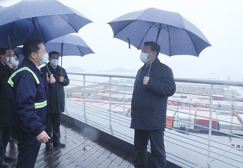 △2020年3月29日,習(xí)近平總書記在浙江寧波舟山港考察調(diào)研??疾旆稻┎蛔?0天,總書記在中央財(cái)經(jīng)委員會第七次會議上,首次提出構(gòu)建新發(fā)展格局。