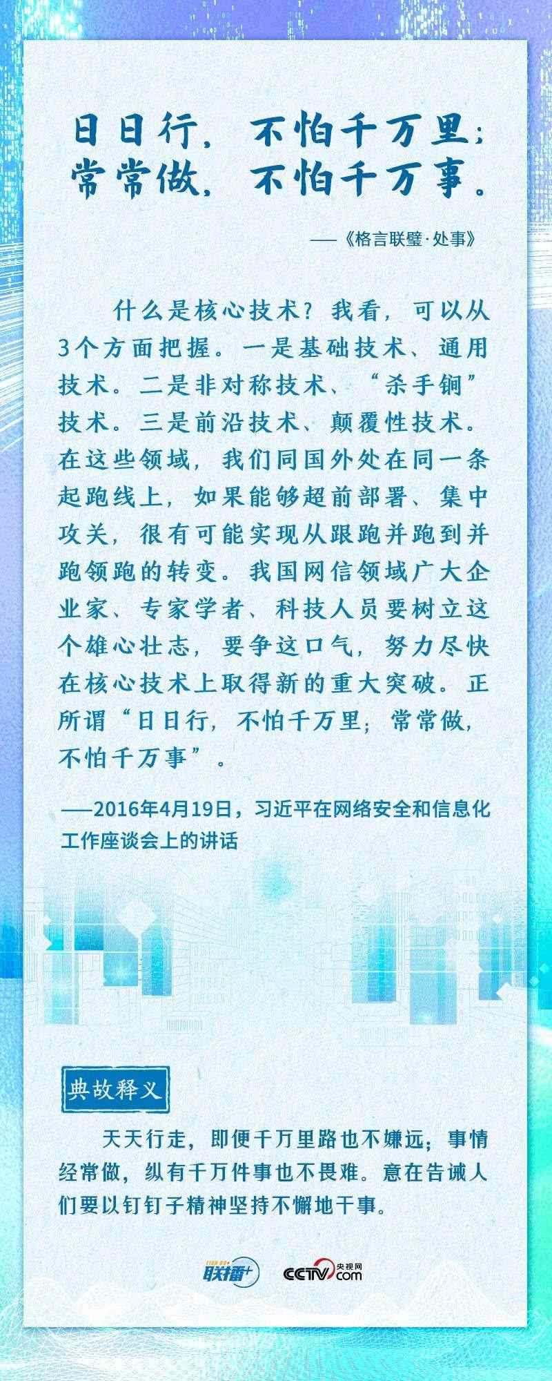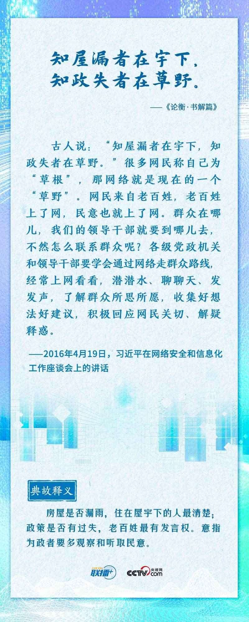 “知屋漏者在宇下,知政失者在草野”“日日行,不怕千萬里;常常做,不怕千萬事”......2016年4月19日,習近平總書記在網(wǎng)絡安全和信息化工作座談會上,從六個方面深刻回答了事關我國網(wǎng)信事業(yè)發(fā)展的一系列重大理論和實踐問題,并多次引經據(jù)典加以闡述。
