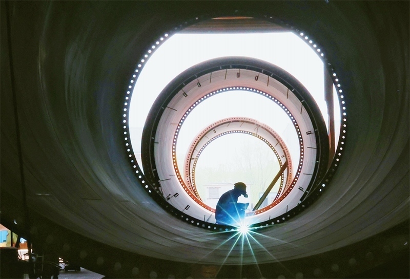 2023年一季度,我國國內生產總值同比增長4.5%,國民經濟開局良好,為實現(xiàn)全年發(fā)展目標奠定了基礎,注入了信心。圖為2023年4月18日,工人在江蘇連云港經濟技術開發(fā)區(qū)一家公司內加工組裝風電塔筒。 中新社發(fā) 耿玉和/攝