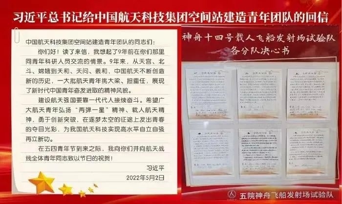 2022年5月2日,習(xí)近平總書記給中國航天科技集團(tuán)空間站建造青年團(tuán)隊(duì)回信,高度肯定航天青年,殷切期待青春奮斗。他強(qiáng)調(diào):“希望廣大航天青年弘揚(yáng)‘兩彈一星’精神、載人航天精神,勇于創(chuàng)新突破,在逐夢太空的征途上發(fā)出青春的奪目光彩,為我國航天科技實(shí)現(xiàn)高水平自立自強(qiáng)再立新功?!币荒陙?,五院人持續(xù)學(xué)習(xí)重溫、堅(jiān)決貫徹落實(shí)習(xí)近平總書記重要回信精神和關(guān)于航天強(qiáng)國建設(shè)的重要指示批示精神,始終做到牢記囑托、感恩奮進(jìn),交出非凡“答卷”。