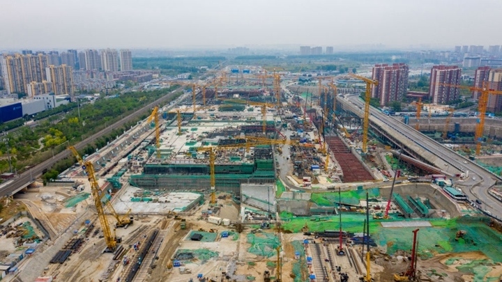 這是在北京市通州區(qū)拍攝的建設(shè)中的北京城市副中心站綜合交通樞紐(2023年4月23日攝,無(wú)人機(jī)照片)。新華社發(fā)(北京城建集團(tuán)供圖)