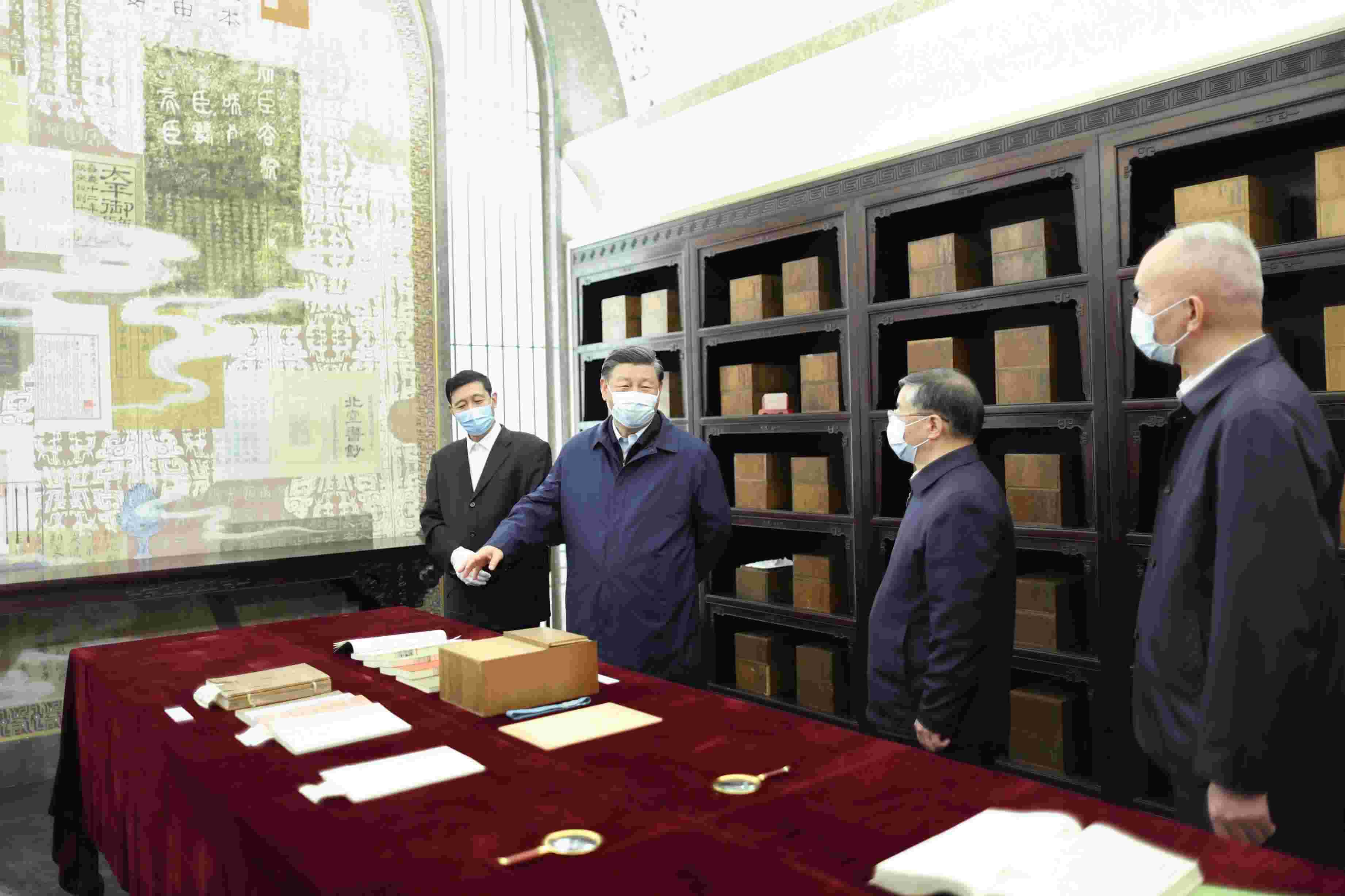 ▲6月2日,中共中央總書(shū)記、國(guó)家主席、中央軍委主席習(xí)近平在北京出席文化傳承發(fā)展座談會(huì)并發(fā)表重要講話。這是座談會(huì)前,習(xí)近平總書(shū)記1日下午在中國(guó)國(guó)家版本館考察時(shí),在蘭臺(tái)洞庫(kù)了解館藏精品版本保存情況。