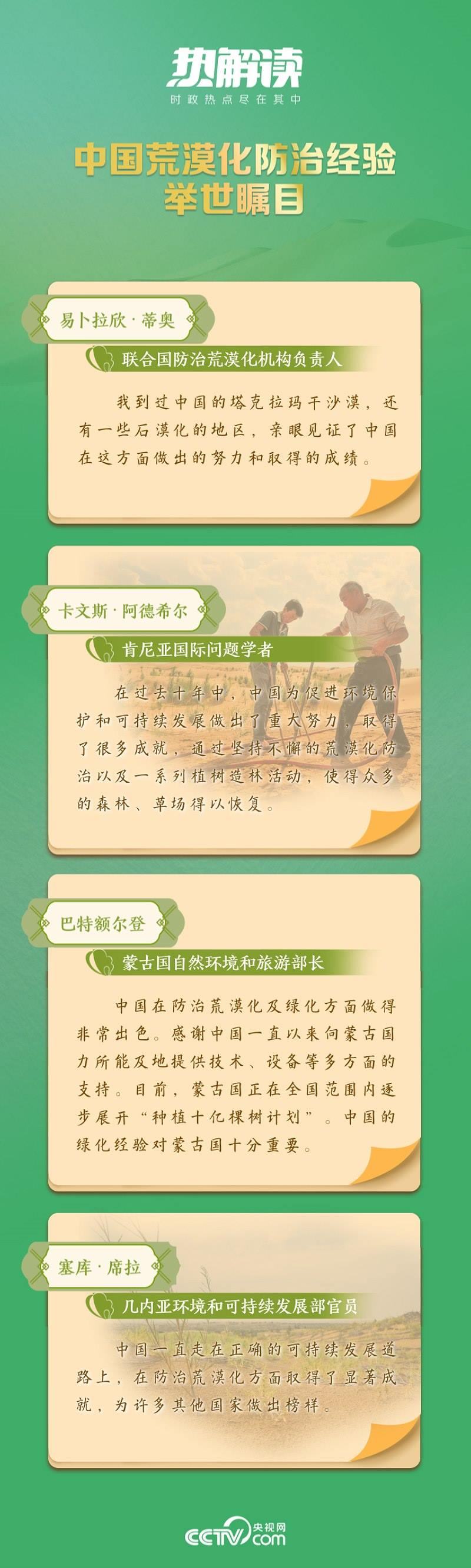 在6月6日召開的座談會上,總書記講到從“沙進人退”到“綠進沙退”的歷史性轉變,講到荒漠化區(qū)域經(jīng)濟社會發(fā)展和生態(tài)面貌發(fā)生了翻天覆地的變化,講到荒漠化和土地沙化實現(xiàn)“雙縮減”,講到防沙治沙法律法規(guī)體系日益健全……這些成績,讓14億多中國人民都倍感榮光。