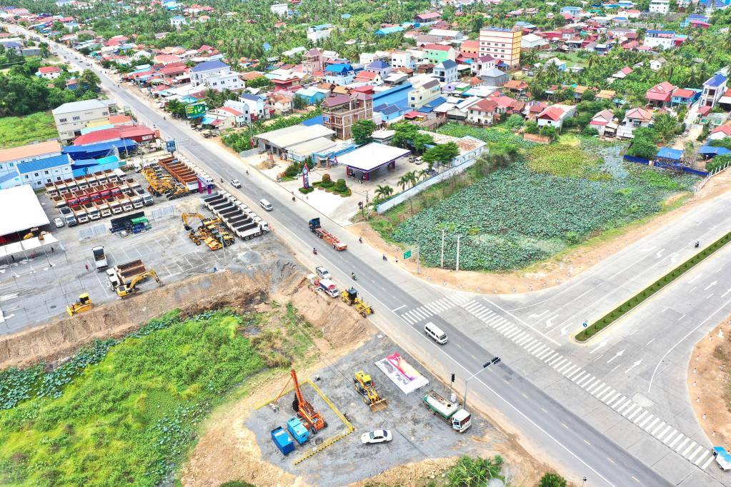 這是6月5日在柬埔寨干丹省拍攝的金巴高速公路施工起點(diǎn)(無(wú)人機(jī)照片)。