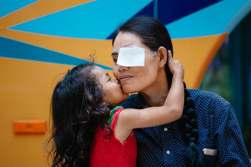 2019年3月15日,在柬埔寨磅湛省醫(yī)院,即將接受白內(nèi)障手術(shù)的患者孫美樂(lè)接受女兒的親吻祝福。在接受了中國(guó)醫(yī)療隊(duì)的白內(nèi)障義診手術(shù)后,她的視力逐步恢復(fù),生活有了新的光明和希望。