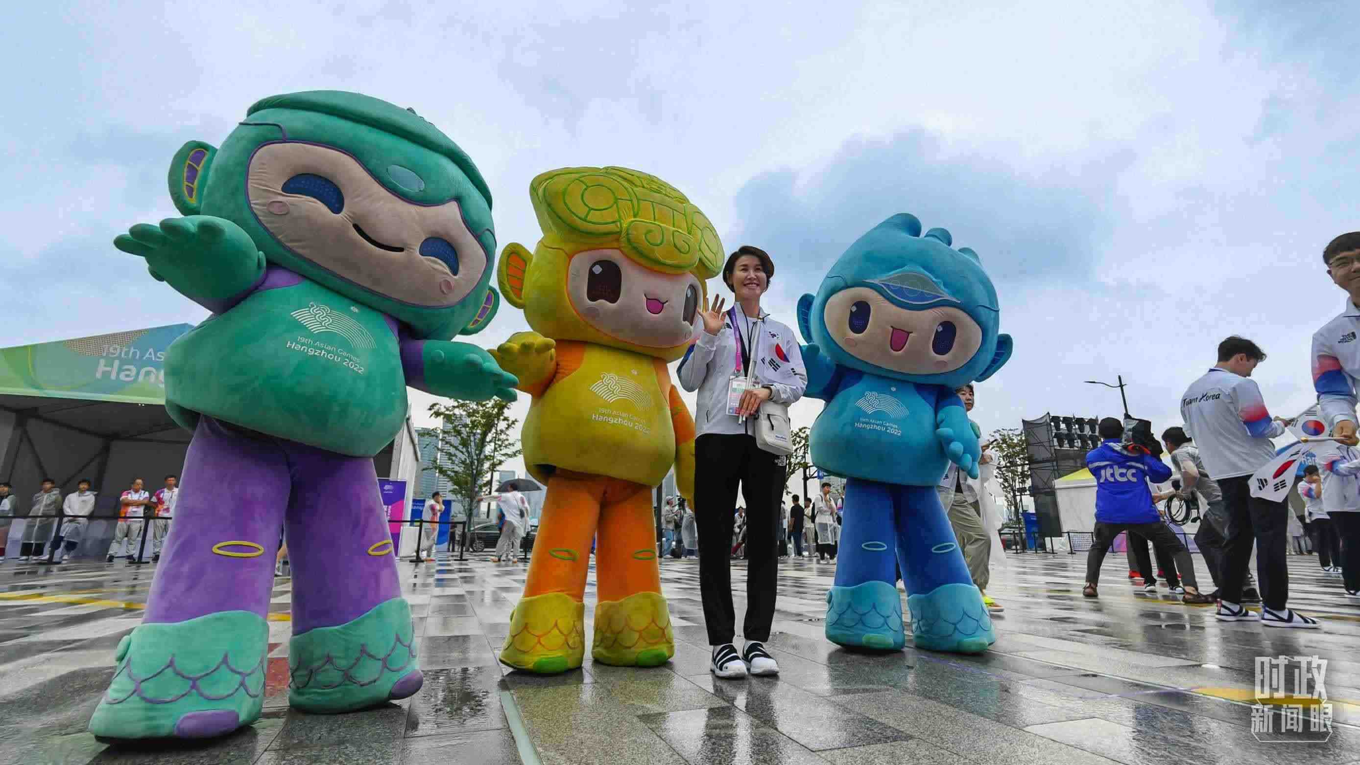 △亞運村為各代表團(tuán)舉行歡迎儀式,隊員們紛紛與吉祥物“蓮蓮”、“琮琮”、“宸宸”合影。(總臺央視記者陳偉奎拍攝)