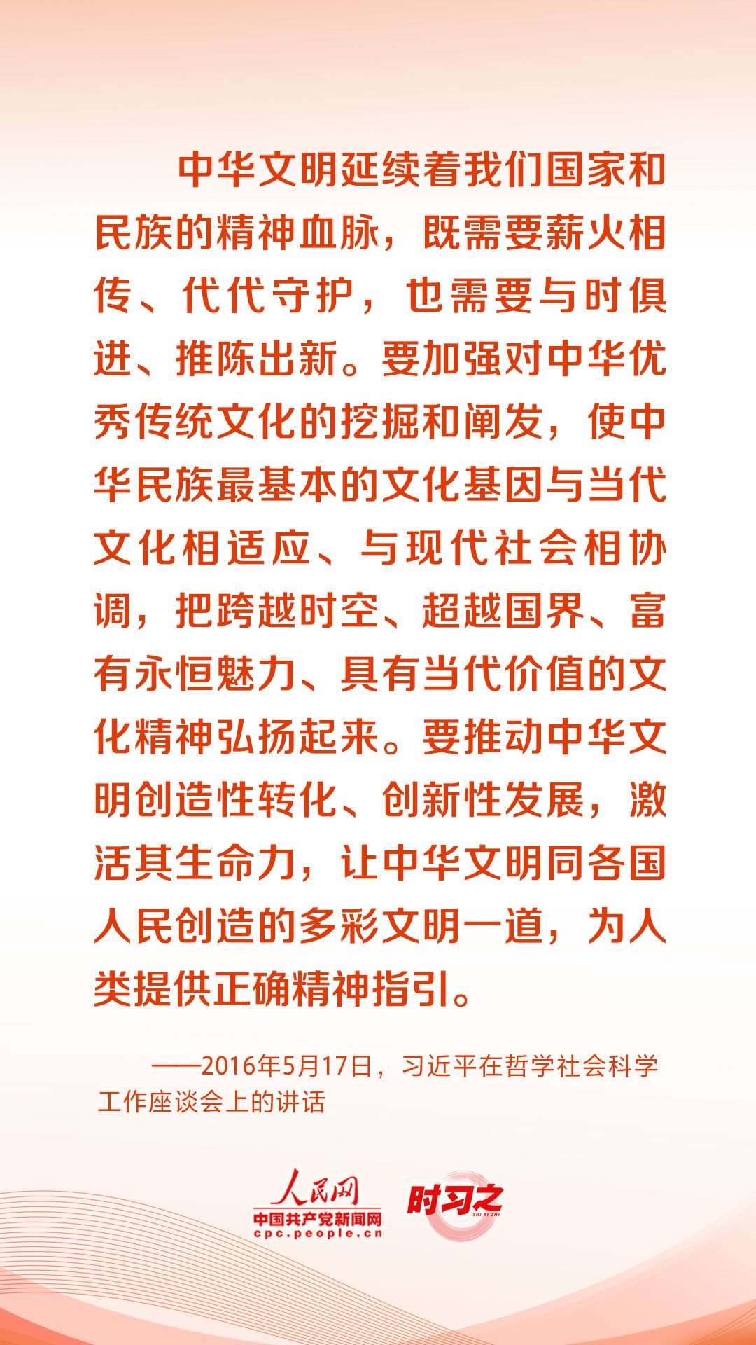 “每一種文明都延續(xù)著一個(gè)國(guó)家和民族的精神血脈,既需要薪火相傳、代代守護(hù),更需要與時(shí)俱進(jìn)、勇于創(chuàng)新?!秉h的十八大以來,習(xí)近平總書記深刻把握新時(shí)代歷史方位,以堅(jiān)定的文化自覺、宏闊的歷史視野、深遠(yuǎn)的戰(zhàn)略考量,就文化建設(shè)提出了一系列新理念新思想新戰(zhàn)略,引領(lǐng)中華文化創(chuàng)造性轉(zhuǎn)化、創(chuàng)新性發(fā)展,推動(dòng)中華文脈綿延繁盛、中華文明歷久彌新。