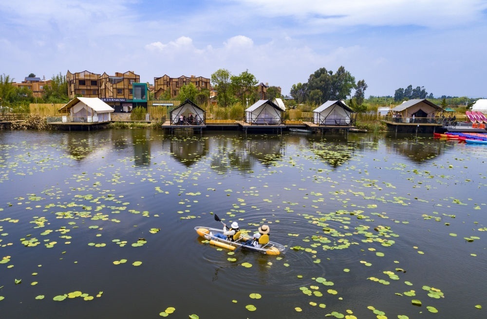 游人在滇池南岸晉寧區(qū)上蒜鎮(zhèn)小漁村劃船休閑(2023年4月30日攝,無人機(jī)照片)。新華社記者 陳欣波 攝
