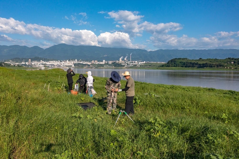 在位于重慶的中國(guó)科學(xué)院三峽庫(kù)區(qū)水土保持與環(huán)境研究站,中國(guó)科學(xué)院成都山地所科研人員在庫(kù)區(qū)消落帶上開展相關(guān)監(jiān)測(cè)(2023年7月5日攝,無人機(jī)照片)。新華社記者 黃偉 攝