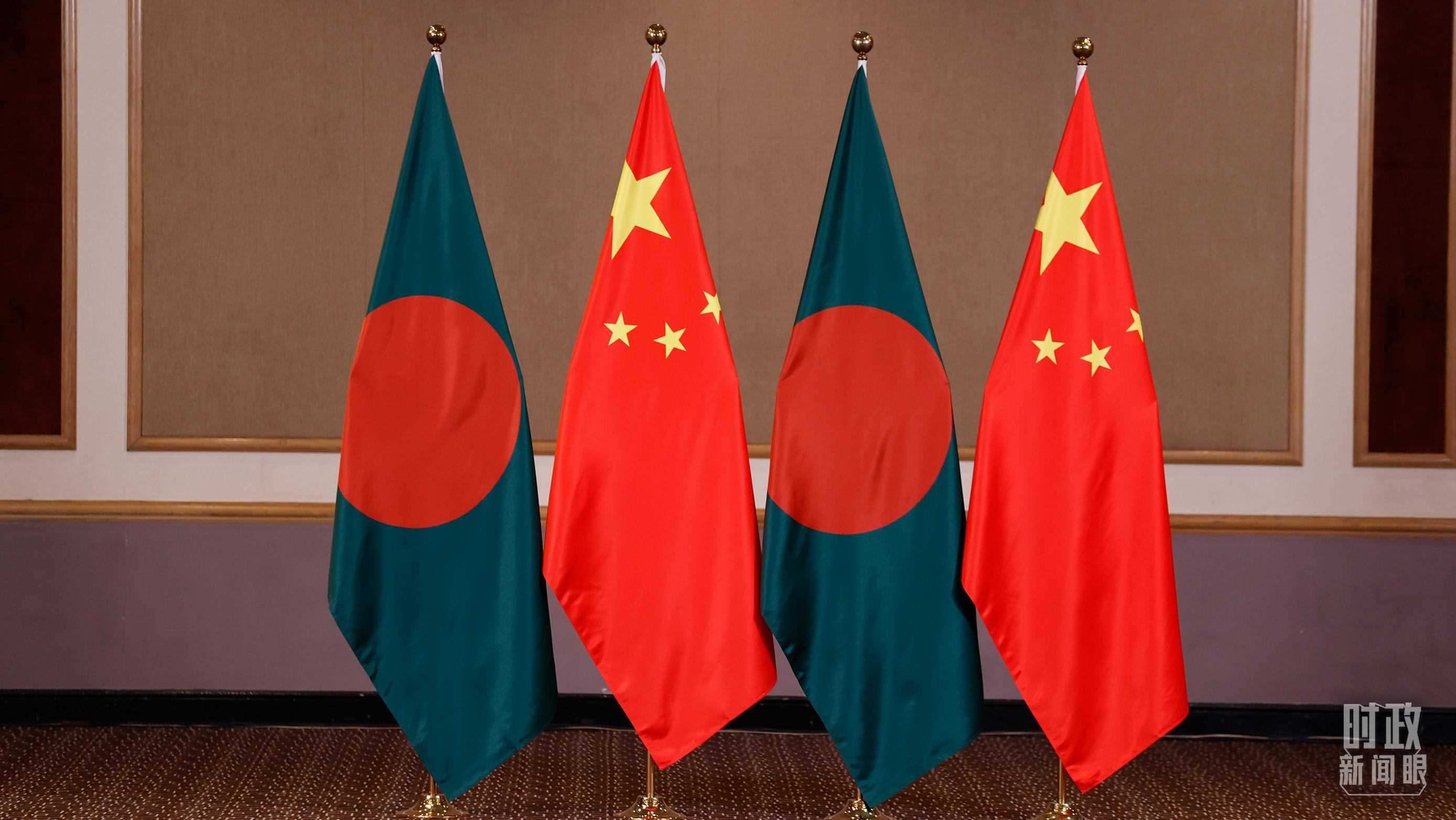 △會見現(xiàn)場的中孟兩國國旗。(總臺央視記者耿小龍拍攝)
