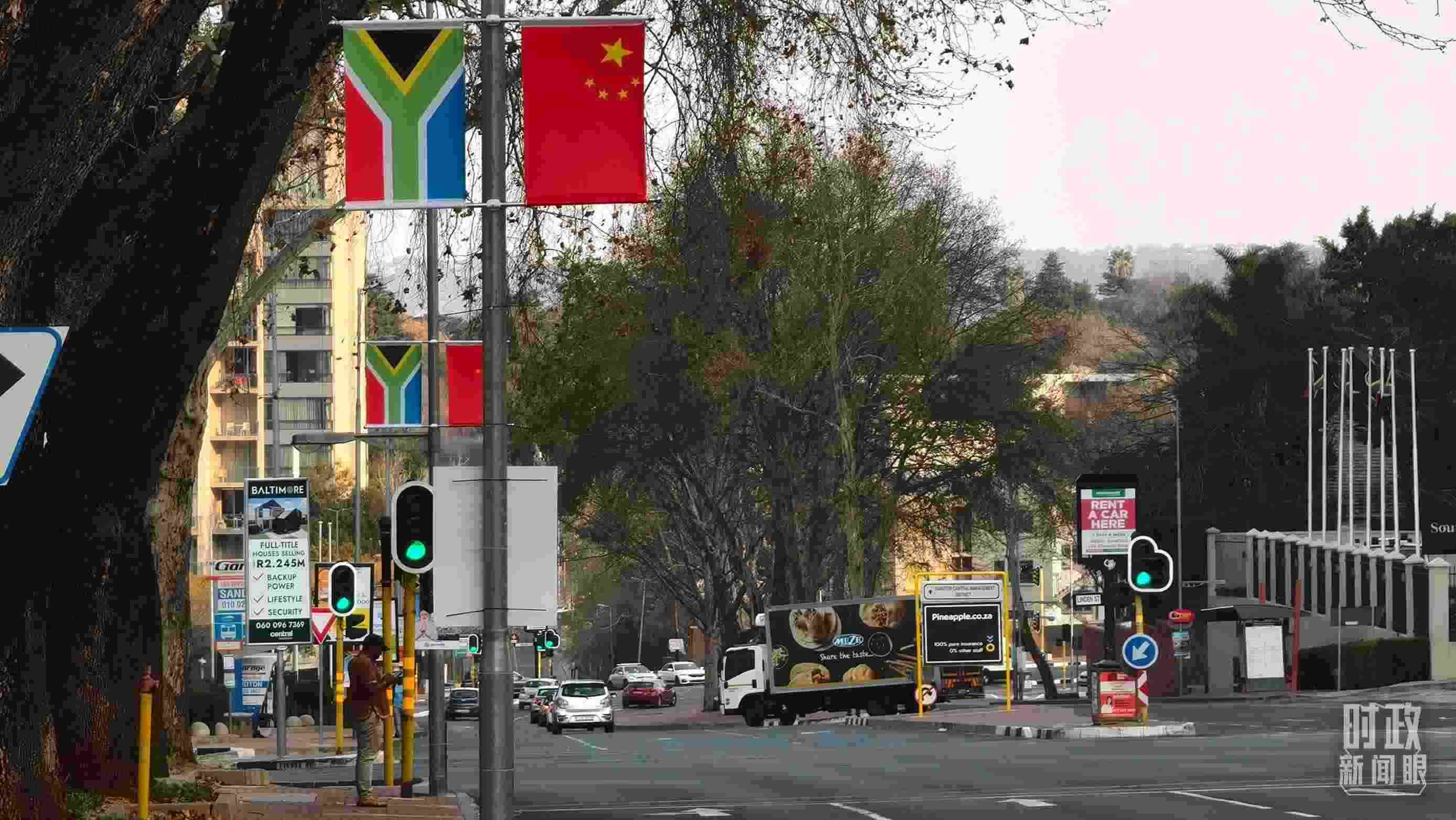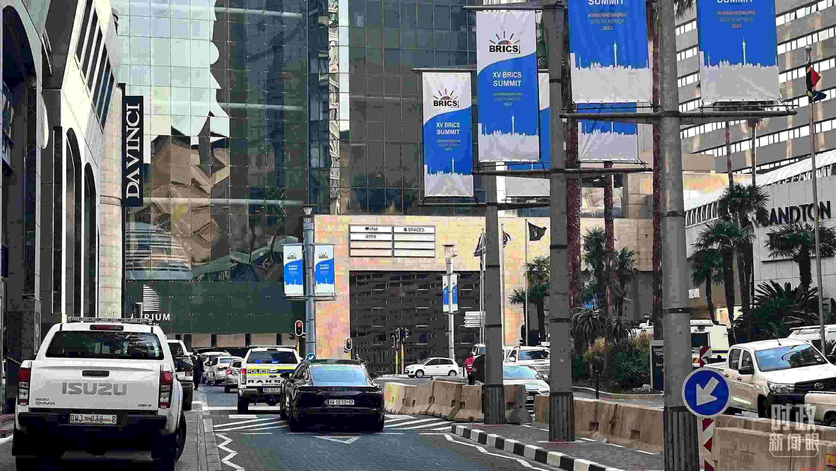△約翰內(nèi)斯堡街道兩側(cè)懸掛的中國國旗。(總臺央視記者韓銳拍攝)