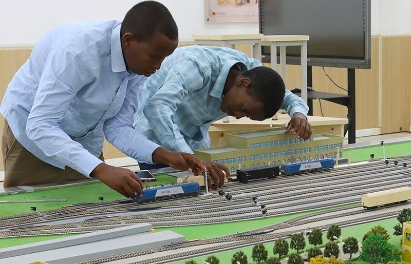 △2022年9月19日,在位于吉布提首都吉布提市的吉布提工商學(xué)校,學(xué)生在魯班工坊鐵道運營沙盤教學(xué)區(qū)學(xué)習(xí)。