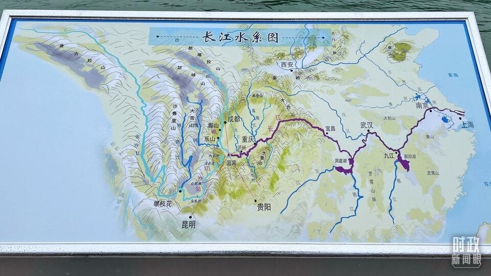 △2020年6月,習(xí)近平在四川宜賓三江口考察。圖為現(xiàn)場展出的《長江水系圖》。(總臺央視記者張宇拍攝)