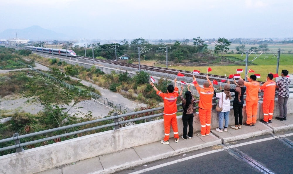 10月17日,在印度尼西亞萬隆一座天橋上,雅萬高鐵建設(shè)單位之一中鐵電氣化局的中國(guó)和印尼籍員工揮舞著中國(guó)和印尼兩國(guó)國(guó)旗,向遠(yuǎn)處駛來的一列雅萬高鐵高速動(dòng)車組列車歡呼(無人機(jī)照片)。新華社記者 徐欽 攝
