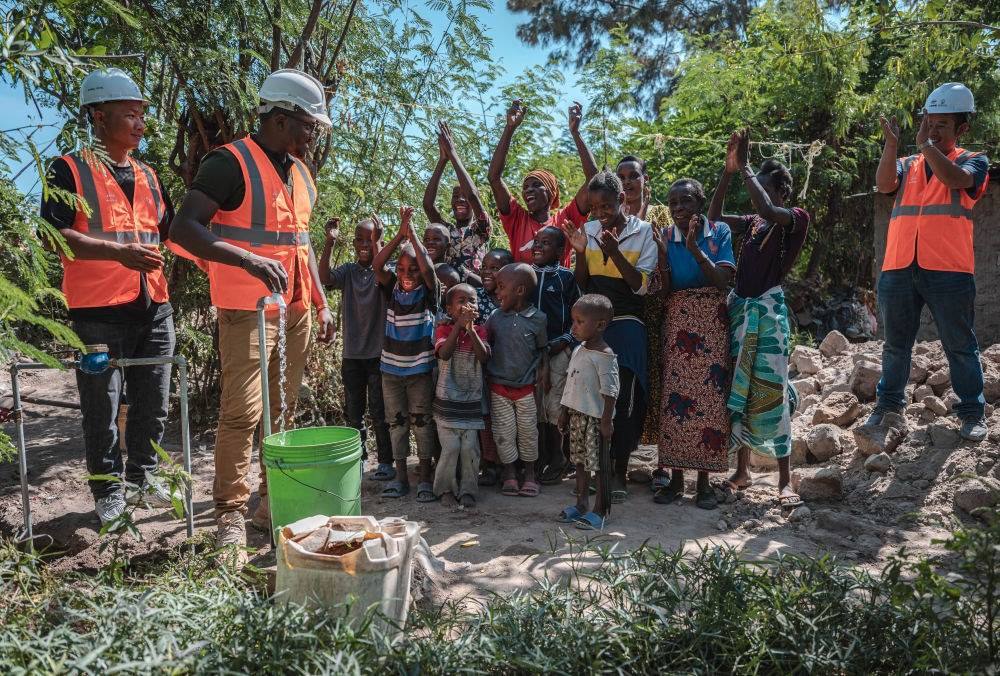 6月13日,在坦桑尼亞姆萬扎省米松圭,凱爾文(左二)與同事接通水管后贏得當(dāng)?shù)鼐用窆恼茪g呼。新華社記者 王冠森 攝