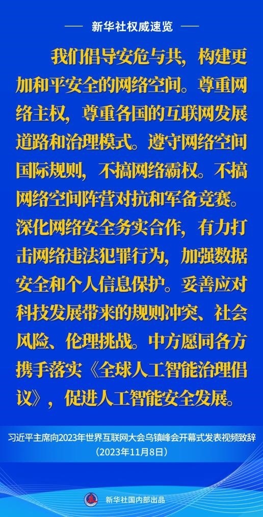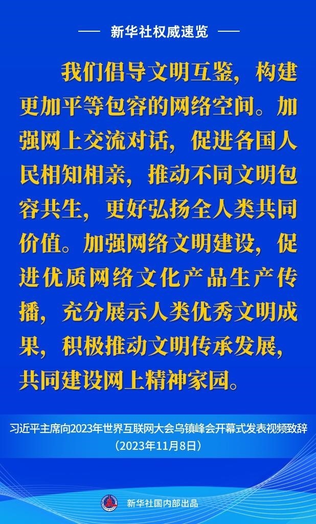 11月8日上午,國(guó)家主席習(xí)近平向2023年世界互聯(lián)網(wǎng)大會(huì)烏鎮(zhèn)峰會(huì)開幕式發(fā)表視頻致辭。一起來(lái)看金句。
