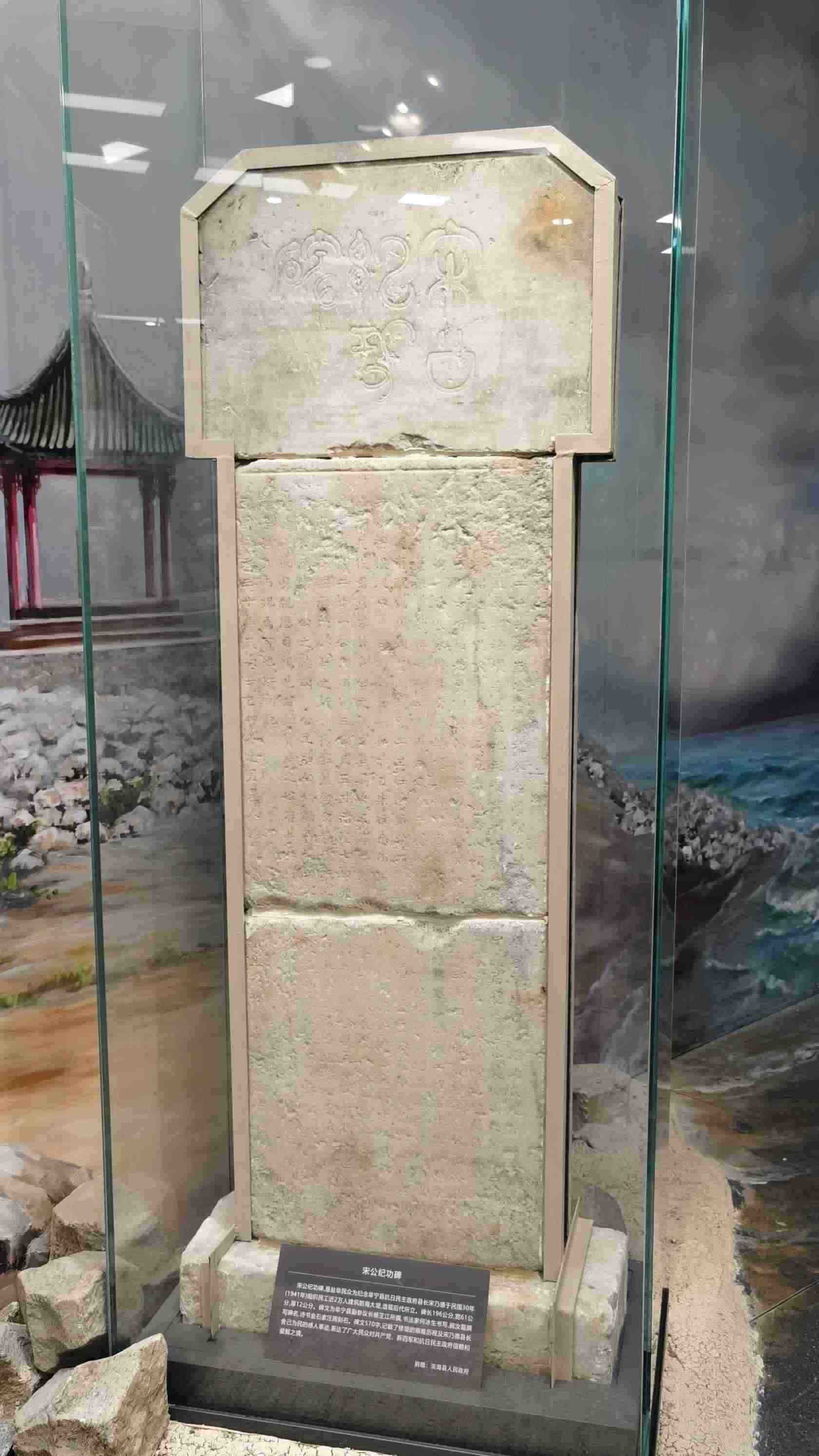 △新四軍紀念館里的宋公紀功碑。此碑是鹽阜民眾為紀念阜寧縣抗日民主政府縣長宋乃德于1941年組織修筑海防大堤所立。碑文記載了修筑大堤的艱難歷程,表達了鹽阜民眾對共產黨、新四軍和抗日民主政府的信賴和愛戴之情。(總臺央視記者郭鴻拍攝)