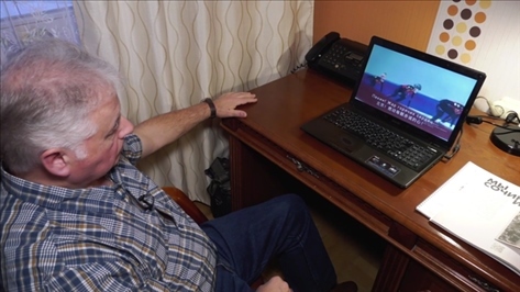 (▲弗拉基米爾·沃羅比約夫觀看由他創(chuàng)作的以北京冬奧會(huì)為主題的俄語(yǔ)歌曲《北京》)