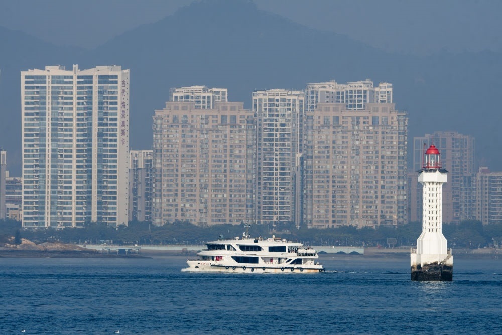 2024年1月5日,一艘游輪在廈門海灣公園附近的海面上穿行。新華社記者 魏培全 攝