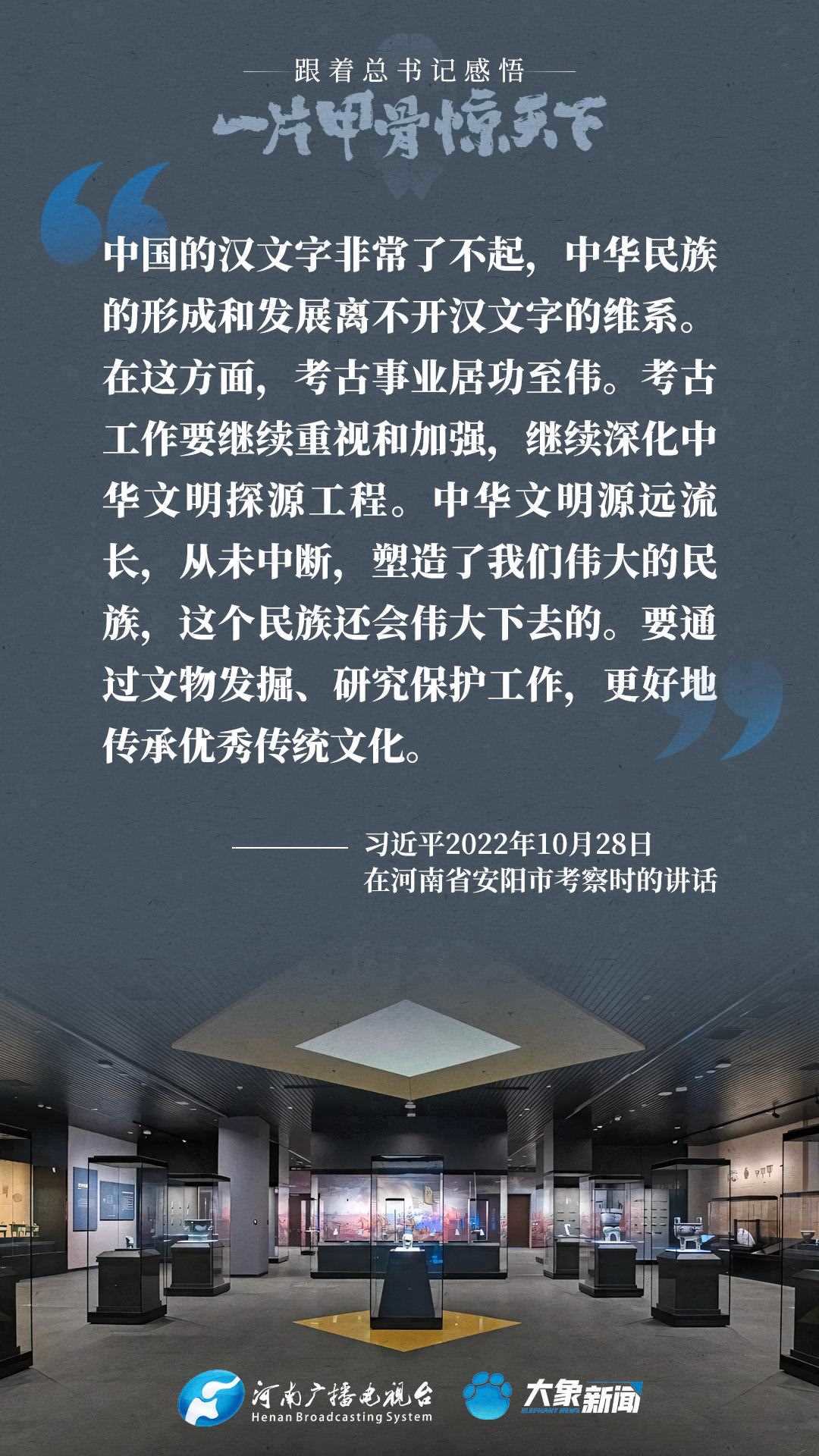 黨的十八大以來,習(xí)近平總書記多次就殷墟和甲骨文保護(hù)研究利用工作作出重要講話重要指示,為我們堅(jiān)定文化自信,傳承發(fā)展中華優(yōu)秀傳統(tǒng)文化提供了根本遵循。大象新聞邀您一起回顧、學(xué)習(xí)。