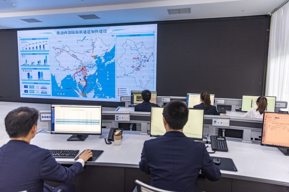 2024年4月22日,工作人員在西部陸海新通道運(yùn)營調(diào)度中心工作。工作人員可以在大屏上實時了解班列在邊境口岸的出入境信息。